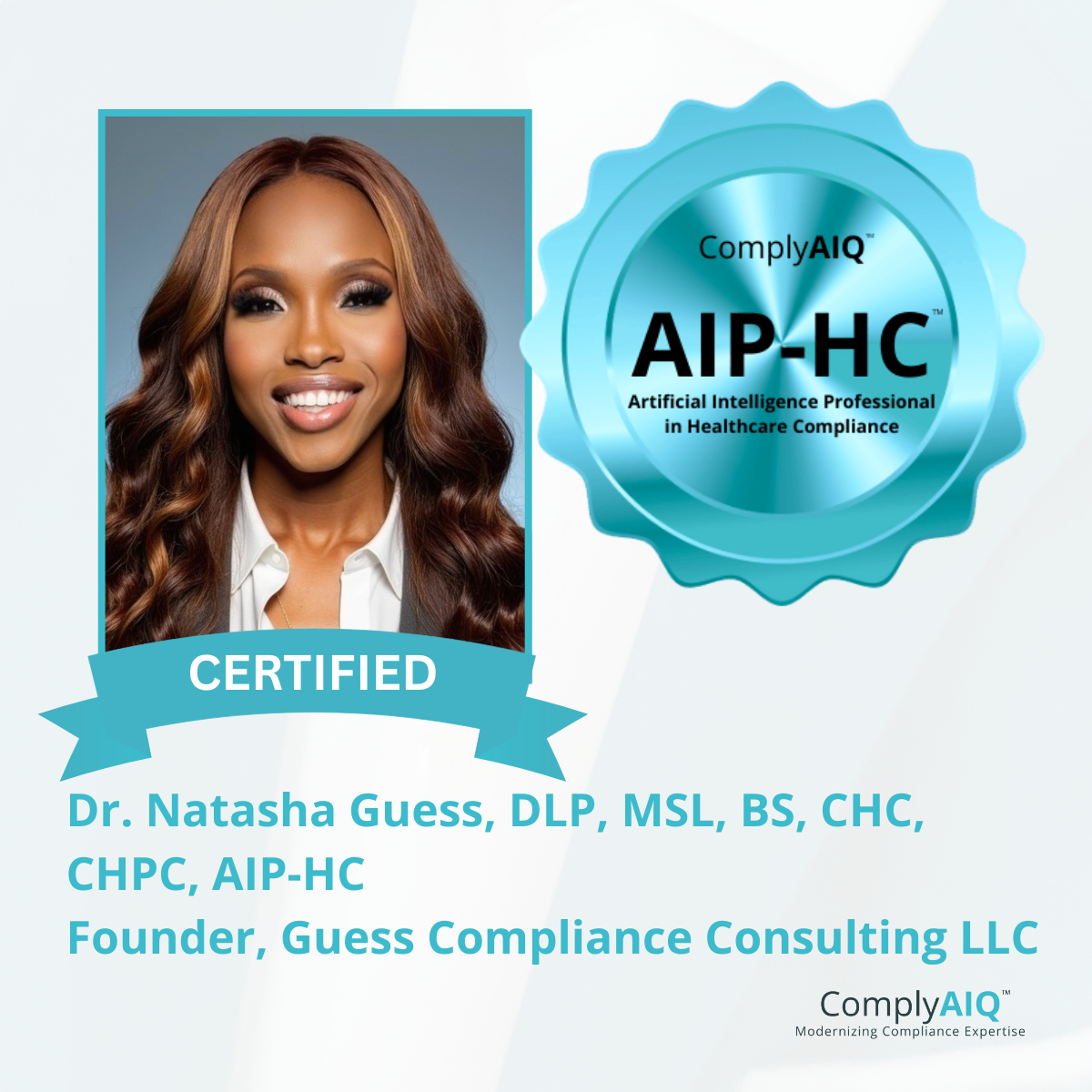 We are pleased to recognize Dr. Natasha Guess, DLP, MSL, BS, CHC, CHPC, AIP-HC on earning the AIP-HC™ – Artificial Intelligence Professional in Healthcare Compliance credential as a member of the Cornerstone Cohort.
