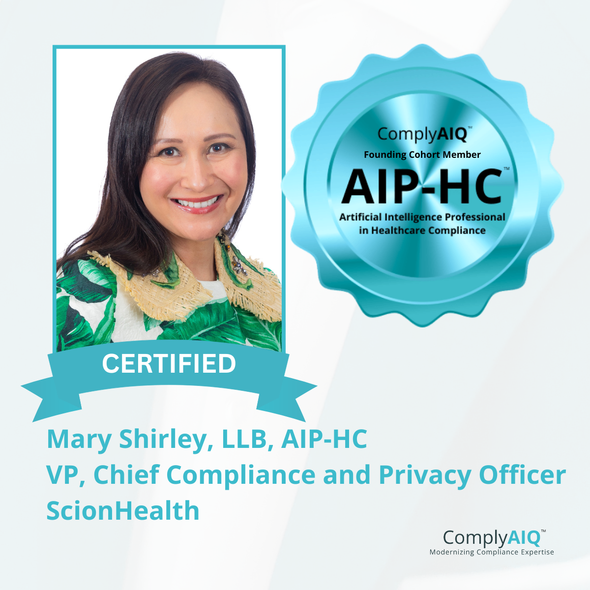 We are pleased to recognize Mary Shirley, LLB, AIP-HC on earning the AIP-HC™ – Artificial Intelligence Professional in Healthcare Compliance credential as a member of the Cornerstone Cohort.